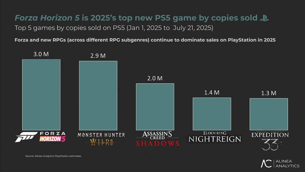 O relatório da Alinea Analytics, compartilhado por Rhys Elliott, detalha como Forza Horizon 5 superou a concorrência no PS5, vendendo mais cópias que outros grandes lançamentos de 2025, como: