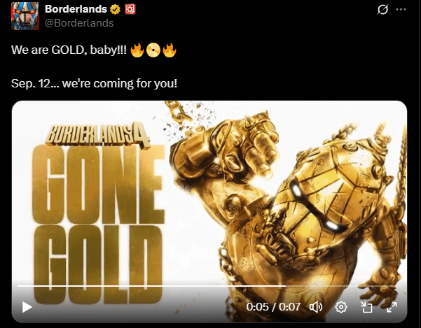 O termo “ir a gold” é um marco na indústria de games que significa que a versão final do jogo está pronta para ser enviada para a prensagem das mídias físicas e para a distribuição nas lojas digitais. Em um comunicado celebratório, a Gearbox elogiou o trabalho duro de seus desenvolvedores para finalizar o projeto.