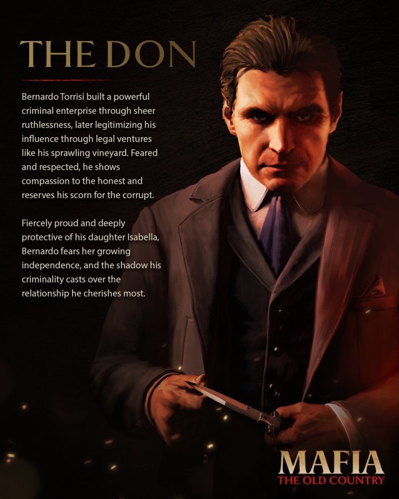 Novas informações sobre os personagens centrais de Mafia: The Old Country foram divulgadas pela Hangar 13 e 2K. Os detalhes, apresentados em artes oficiais, revelam a história e as motivações de Enzo, o protagonista; Don Bernardo Torrisi, o chefe da família criminosa; e sua filha, Isabella, estabelecendo o cenário para o drama que se desenrolará na Sicília do início do século XX.