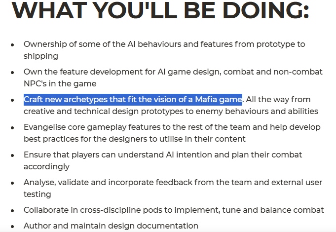 “Crie novos arquétipos que se encaixem na visão de um jogo da franquia Mafia, desde protótipos de design criativo e técnico até comportamentos e habilidades dos inimigos.”