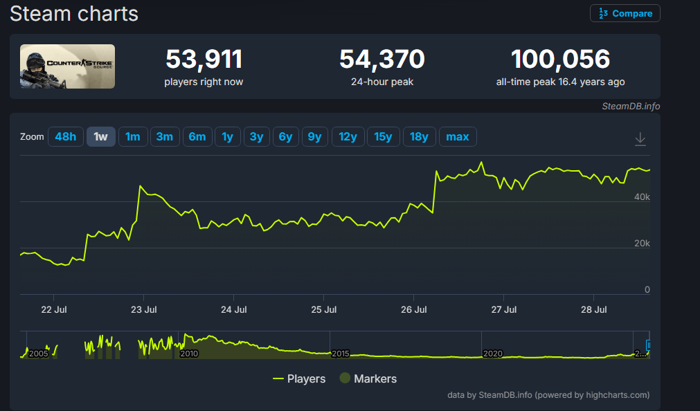 Lançado há mais de 20 anos, o clássico Counter-Strike: Source viveu um fim de semana de glória inesperada na Steam. O jogo atingiu um pico de quase 57.000 jogadores simultâneos, a maior marca registrada na plataforma em mais de 13 anos. O motivo para essa ressurreição repentina parece estar ligado a outro ícone da era de ouro da Valve: Garry’s Mod.