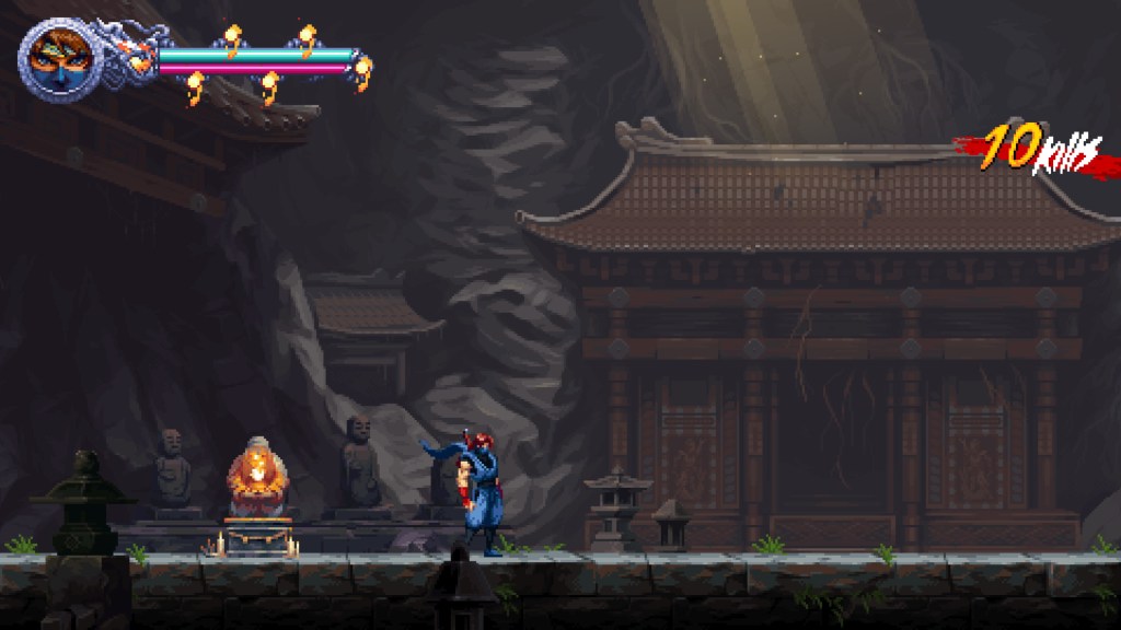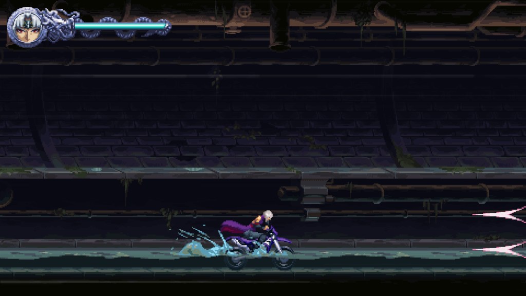 O jogo também surpreende com a dualidade de protagonistas. Em certos momentos, Kenji se depara com um obstáculo impenetrável. Nesses pontos, podemos assumir o controle de Kumori, que entra em uma espécie de mundo paralelo para resolver excelentes seções de plataforma e abrir o caminho. A variedade é ampliada com o retorno de fases de veículo, como as de lancha e moto, uma clara homenagem aos clássicos do NES.