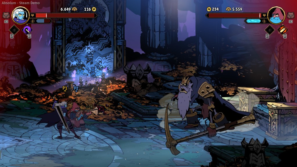 É na jogabilidade que Absolum se consagra. O jogo extrai o melhor do DNA da Guard Crush Games, com controles precisos e um sistema de combate profundo, que recompensa combos habilidosos, esquivas e aparos (parries) com a finesse de um jogo de luta. A estrutura roguelite entra de forma brilhante: a cada nova tentativa, você renasce em um santuário com varios NPCs e encontra cristais que oferecem melhorias, muito parecido com Hades. No entanto, as fases são desenhadas à mão, como em um beat ‘em up clássico, mas com múltiplos caminhos a serem escolhidos, garantindo rejogabilidade sem perder o design intencional.
