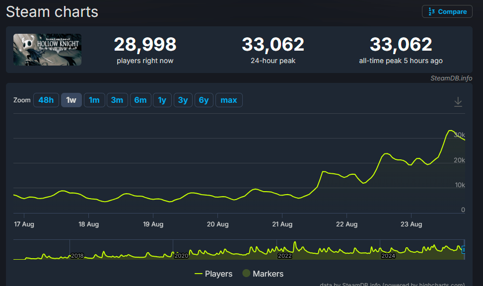 Os dados, registrados pelo site SteamDB, mostram um aumento expressivo no interesse pelo aclamado metroidvania, mesmo oito anos após seu lançamento. A marca de mais de 33 mil jogadores simultâneos é um feito raro para um jogo single-player tão antigo e demonstra a paixão e a dedicação da comunidade.