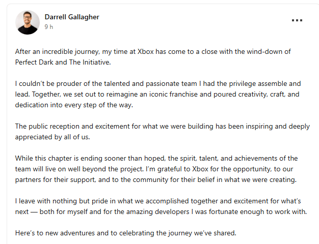Darrell Gallagher, o chefe do estúdio The Initiative da Xbox, anunciou oficialmente sua saída da empresa. A decisão marca o fim de um capítulo turbulento, que culminou no cancelamento do aguardado reboot de Perfect Dark há mais de dois meses e no consequente encerramento das atividades do estúdio.