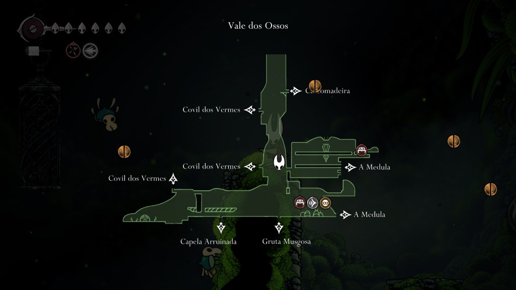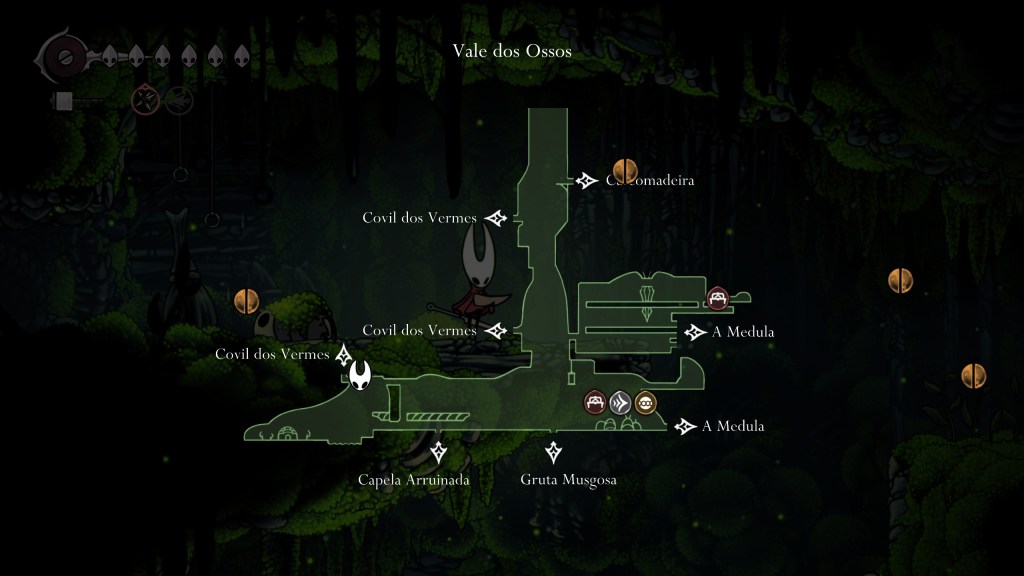 Com a chave em mãos, siga para a localização indicada no mapa abaixo. Você encontrará uma jaula com um inimigo patrulhando. Para atravessar o buraco, caso não tenha o dash, você precisará pular sobre o inimigo e use um ataque para baixo para impulsionar seu pulo e conseguir subir.