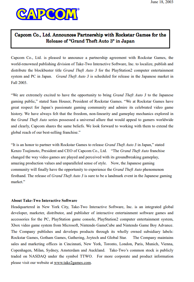 Novos dados históricos, retirados dos arquivos da Capcom, revelaram os números de vendas da trilogia 3D original de Grand Theft Auto no Japão. Na época, a Rockstar Games tinha uma parceria com a Capcom para publicar seus jogos no mercado japonês, o que resultava em lançamentos tardios e localizados.