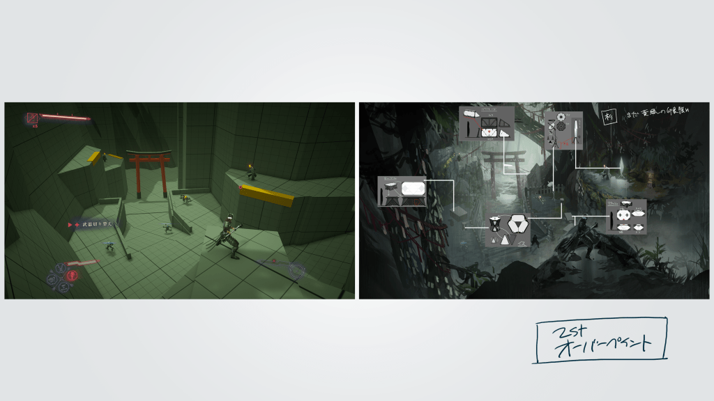 Nishii detalha os diferentes tipos de arte conceitual usados no desenvolvimento, desde as “artes de imagem” que estabelecem a atmosfera geral, até os “overpaintings” que refinam o design dos cenários já em protótipo. Uma das imagens mostra como a equipe de arte desenha sobre um cenário “whitebox” (um protótipo 3D básico) para adicionar detalhes, guiar o olhar do jogador e reforçar a direção e o fluxo de uma fase.