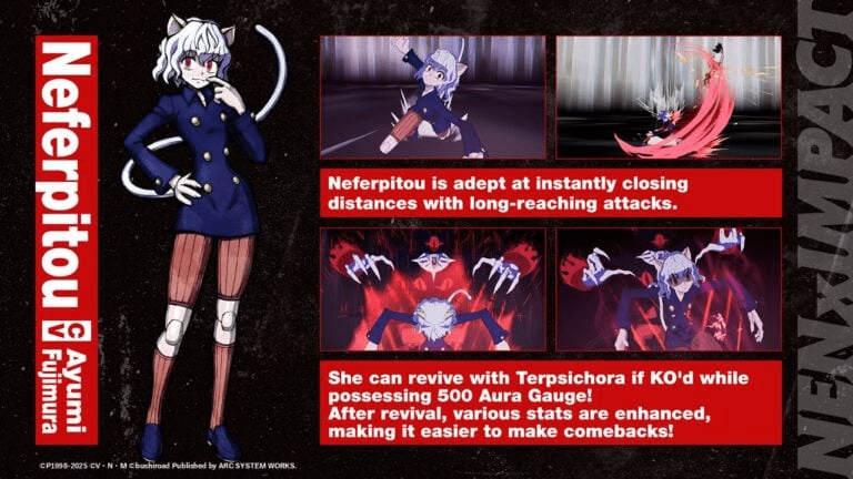 A personagem é descrita como uma especialista em “encurtar distâncias instantaneamente com ataques de longo alcance”, mas sua característica mais marcante é uma mecânica de sobrevivência única. Se Neferpitou for nocauteada enquanto tiver 500 de Aura ou mais, ela pode usar sua habilidade Terpsichora para se reviver.