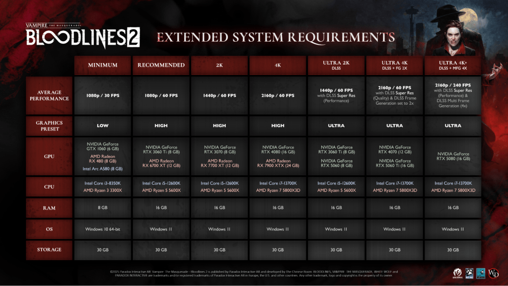 A desenvolvedora The Chinese Room divulgou hoje os requisitos finais de sistema para a aguardada versão de PC de Vampire: The Masquerade – Bloodlines 2. As especificações detalham o hardware necessário para rodar o RPG de vampiros em diversas configurações, do mínimo em 1080p até o Ultra em 4K com altas taxas de quadros.