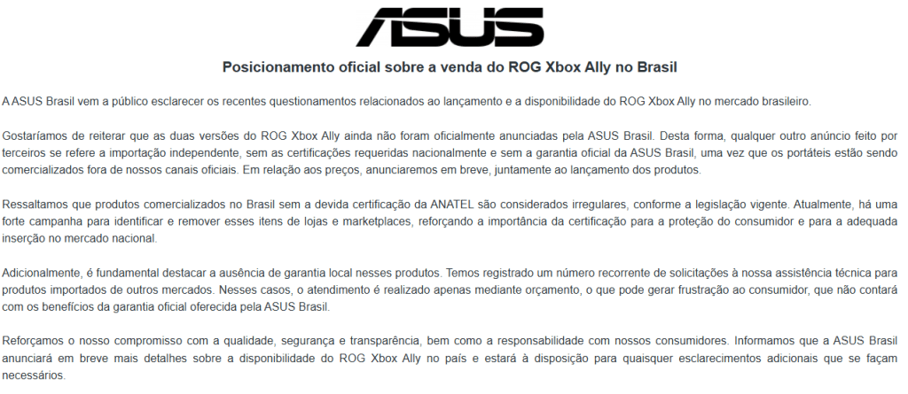 A ASUS finalizou o comunicado reafirmando que anunciará “em breve” os detalhes sobre a disponibilidade oficial do ROG Xbox Ally no país, com todas as garantias e certificações necessárias.