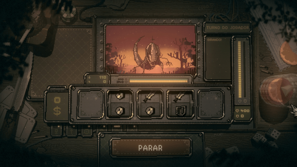 Cada turno, a máquina gira. E aqui está o pulo do gato: você tem controle. Pode parar cada rolo no momento certo, tentando alinhar três itens iguais para ativar um crítico devastador. Parece bobagem? Eu também achei. Até perder três horas seguidas tentando “só mais uma run”.