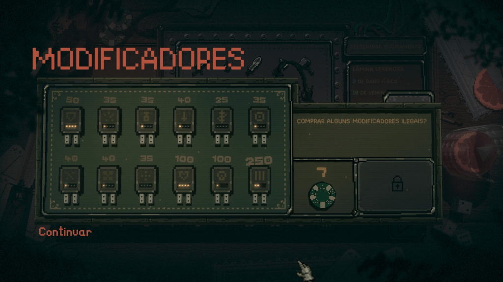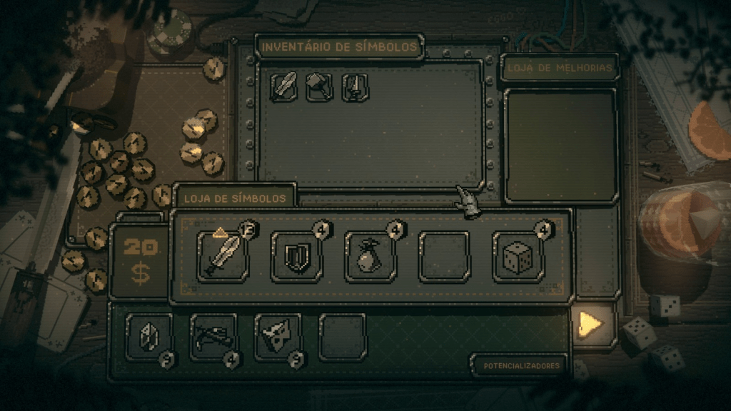 Fichas: Essa é a principal. A moeda permanente que você usa no menu principal para comprar Modificadores (aquelas melhorias que ficam pra sempre). Reviver uma vez, aumentar defesa base, ou o mais importante: expandir a máquina para mais rolos. E é aí que o jogo se transforma completamente.