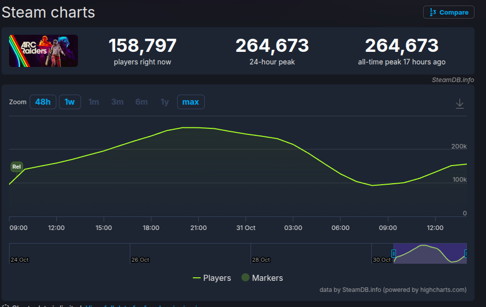 O novo pico colocou ARC Raiders na 6ª posição dos jogos mais jogados no Steam nas últimas 24 horas, atrás apenas dos líderes habituais (Counter-Strike 2, Dota 2, PUGB) e de Battlefield 6 (461.385) e Escape from Duckov (265.182).