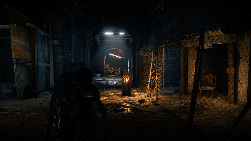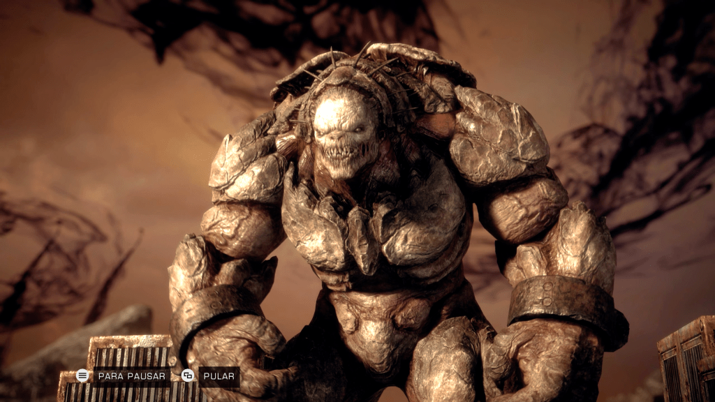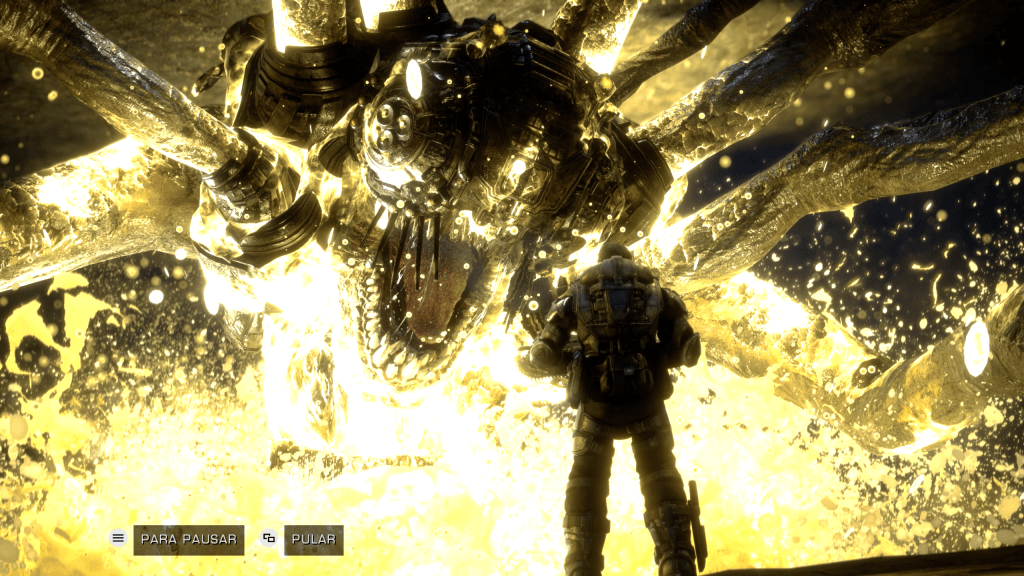 Os efeitos sonoros também são excelentes. Você sente o peso do Marcus ao correr, ouve o impacto metálico da armadura pesada. Um tiro de Gnasher estourando um inimigo tem um peso sonoro visceral.