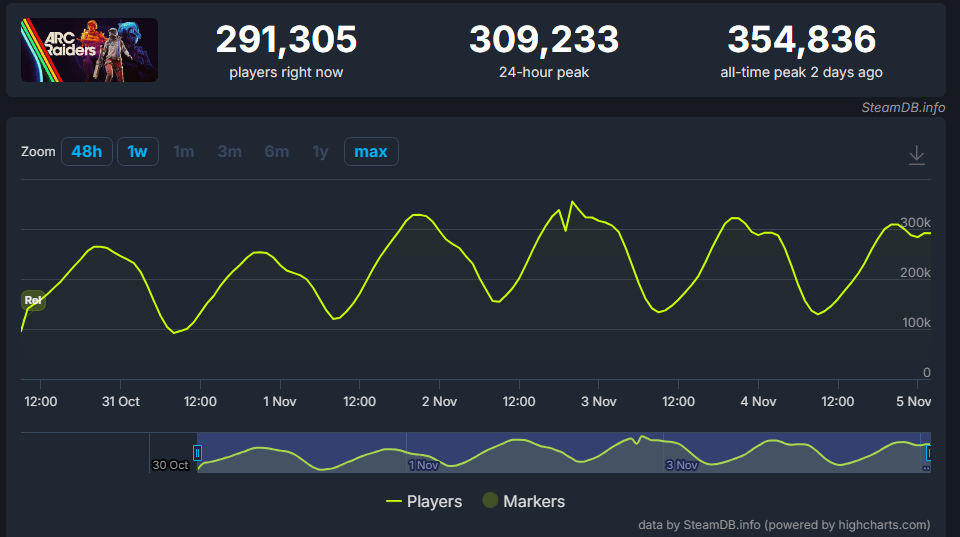 Na semana anterior, o jogo já aparecia em quinto lugar apenas com as pré-vendas. Após o lançamento, ARC Raiders ultrapassou a marca de 354.836 jogadores simultâneos no Steam. O sucesso foi tão repentino que os servidores enfrentaram instabilidades, exigindo a implementação de filas de espera e a desativação temporária do crossplay.
