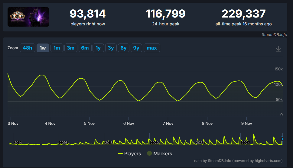 O que mais chama a atenção é a comparação com o jogo original, lançado há 12 anos. O primeiro Path of Exile, impulsionado pela recente atualização “Keeper of the Flame”, registra picos regulares acima de 110.000 usuários.