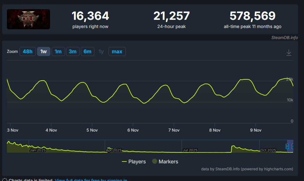 Após um lançamento de sucesso em acesso antecipado (há cerca de um ano) que atingiu um pico recorde de 578.569 usuários, o jogo teve um declínio acentuado. Recentemente, Path of Exile 2 tem registrado picos de apenas 20.000 jogadores, uma queda superior a 95% desde o seu auge.