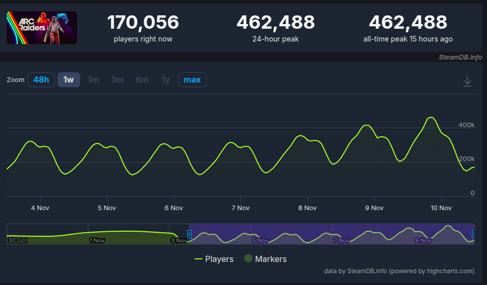 O crescimento é o dado mais significativo. ARC Raiders, que não é um título gratuito, teve 264.000 usuários nas primeiras 24 horas (30 de outubro) e subiu para 354.000 no primeiro fim de semana. O novo recorde de 462.000 jogadores representa um crescimento de mais de 75% em relação à sua estreia.