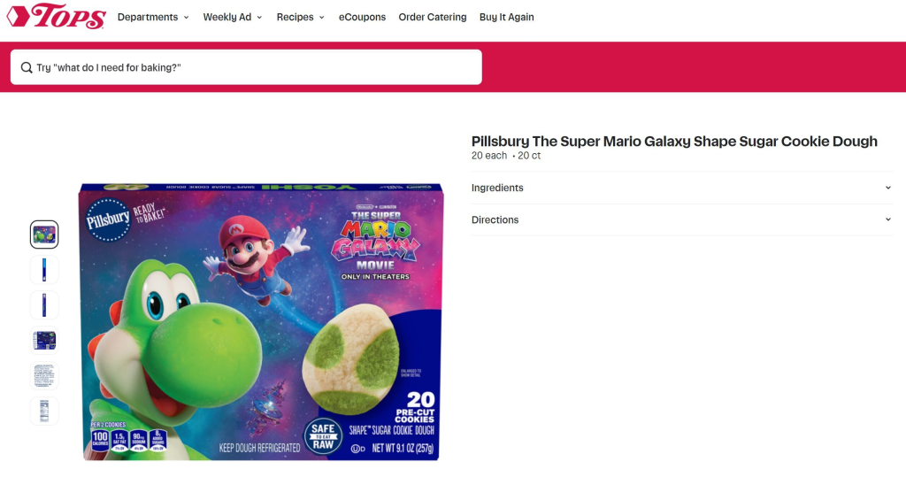 O produto, chamado Super Mario Galaxy Shape Sugar Cookie Dough, foi listado brevemente no site da rede de supermercados Tops, em Nova York. A embalagem traz 20 cookies em formato de ovos de Yoshi, e mais importante: uma imagem inédita do personagem, que aparece com design adaptado para o longa animado.