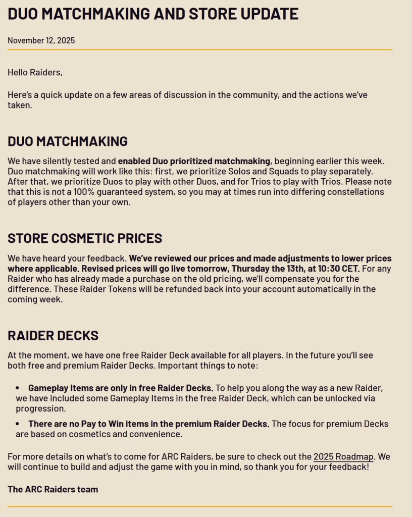 A Embark Studios, celebrando o sucesso de Arc Raiders (que bateu 700.000 jogadores simultâneos), atendeu às duas maiores reclamações da comunidade: o preço das skins e a falta da fila Duo.