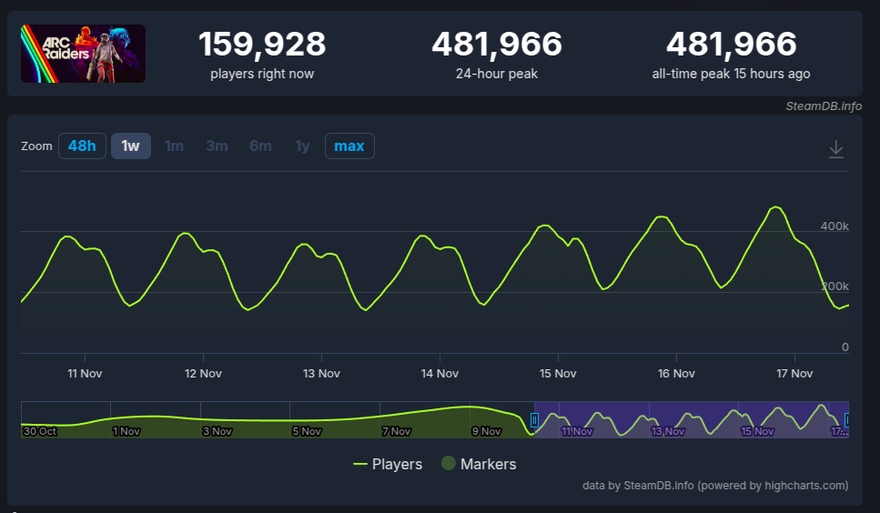 Segundo dados do SteamDB, ARC Raiders registrou 462.488 jogadores simultâneos no fim de semana de 8 a 9 de novembro, ultrapassando os 441.035 de Battlefield 6. No fim de semana seguinte, o jogo quebrou seu próprio recorde com 481.966 jogadores, enquanto Battlefield caiu para 299.135.