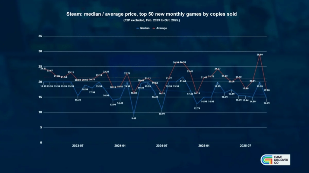 Os dados mostram que a media de preço dos 50 títulos mais vendidos por mês desceu de US$ 19,50 para US$ 15,64. A queda é impulsionada pelo sucesso massivo de jogos indie lançados na faixa de US$ 5 a US$ 15 (como Content Warning e Buckshot Roulette e PEAK), que competem pela atenção do jogador com projetos de orçamento milionário.