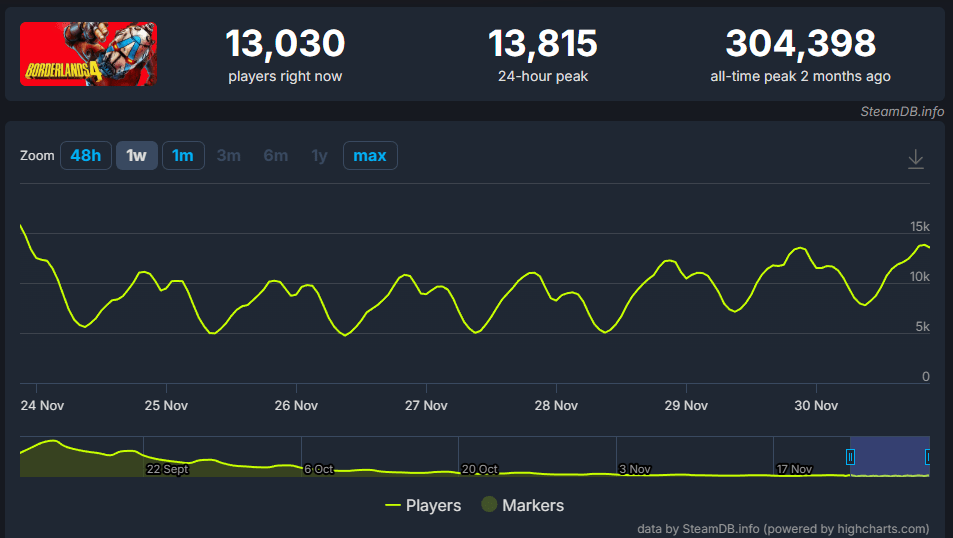 Dois meses após seu lançamento, Borderlands 4 enfrenta uma queda massiva de engajamento na Steam. O looter shooter da Gearbox, que estreou em 12 de setembro com um recorde de 304.398 jogadores simultâneos, viu sua base ativa despencar para cerca de 13.000 usuários nas últimas 24 horas, uma queda de aproximadamente 96%.