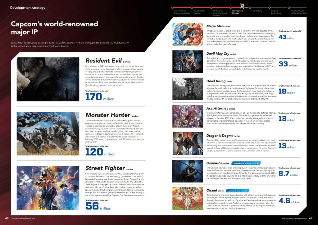 Logo atrás, consolidando-se como o segundo pilar da empresa, está Monster Hunter, com 120 milhões de cópias. A série teve um crescimento exponencial na última década, impulsionada pelo sucesso global de World e Rise. Completando o pódio, a franquia de luta Street Fighter soma 56 milhões de unidades.