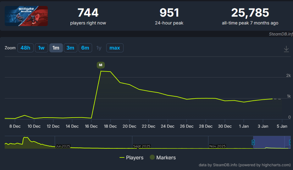 A tentativa da 1047 Games de revitalizar sua franquia de tiro com Splitgate Arena Reloaded parece estar enfrentando dificuldades. Lançado em 17 de dezembro como uma reformulação completa de Splitgate 2, o jogo registrou um pico de apenas 2.297 jogadores simultâneos no Steam, estabilizando-se recentemente em torno de 1.000 usuários ativos. O número contrasta drasticamente com o beta do Splitgate original, que chegou a atrair mais de 67 mil pessoas.