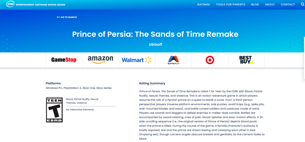 ESRB, órgão de classificação indicativa dos EUA, listou Prince of Persia: The Sands of Time Remake em seu banco de dados, um forte indício de que o desenvolvimento está concluído e a estreia está próxima. O registro atribuiu a classificação “T” (Teen) e confirmou um detalhe nostálgico: a descrição menciona uma “sequência de rolagem lateral 2D”, indicando que o jogo original de 1989 estará incluso como um easter egg, tal qual na versão de 2003.