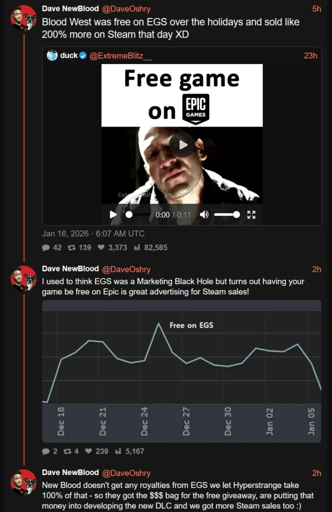 Um fenômeno inusitado ocorreu com o FPS de terror Blood West durante o período de festas. Dave Oshry, fundador da publisher New Blood, revelou que no dia em que o jogo foi oferecido gratuitamente na Epic Games Store, suas vendas na Steam dispararam, registrando um aumento de 200%.
