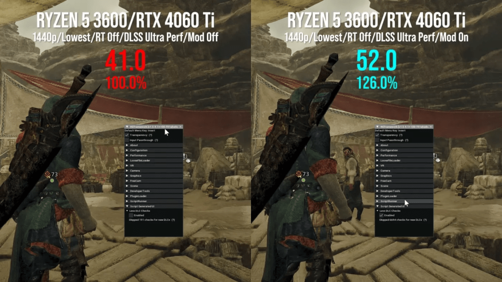 Os testes confirmaram a existência do bug: o jogo realiza milhares de verificações de DLC em segundo plano quando o jogador está próximo a NPCs de suporte nos acampamentos (Hubs), o que pode reduzir o framerate em até 25% em cenários limitados pela CPU (testado em um Ryzen 5 3600). O uso do mod “Less DLC Checks” resolve o problema imediatamente.