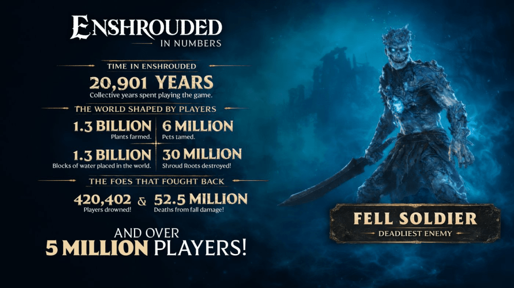 O anúncio veio acompanhado de estatísticas impressionantes sobre o desempenho do jogo desde sua estreia em janeiro de 2024. Enshrouded já ultrapassou a marca de 5 milhões de jogadores, que acumularam juntos mais de 20 mil anos de tempo de jogo e coletaram 1,3 bilhão de recursos.