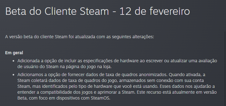Além disso, a atualização Beta incluiu a opção de enviar dados de taxa de quadro para a Valve, visando melhorar a compatibilidade de jogos, e um campo para adicionar comentários ao reportar títulos incompatíveis com o Steam Deck.
